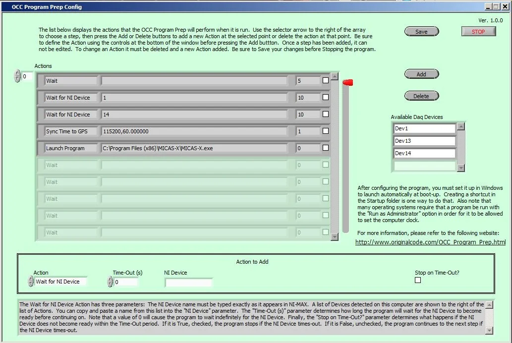 OCC Program Prep has five actions, each of which can be used as many times as desired, in any order. The actions are: Wait, Wait Until NI Device is Ready, Launch a Program, Sync Time to NTP Server, and Sync Time to GPS. Thus, besides waiting for NI Devices to fully initialize, the OCC Program Prep program can also be used to synchronize the computer clock to an external source. This can be important for several reasons. Whenever a data acquisition program uses software timing, having that program synchronize the computer clock to an external source after the program has started can potentially lead to timing errors. Thus it can be beneficial to synchronize the computer clock before the data acquisition program starts.